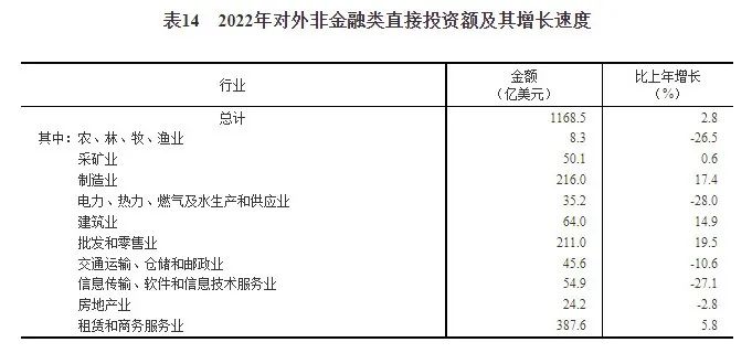 全年對(duì)外非金融類直接投資額7859億元,比上年增長(zhǎng)7.2%,折1169億美元,增長(zhǎng)2.8%。其中,采礦業(yè)2022年對(duì)外非金融類直接投資額50.1億美元,比上年增長(zhǎng)0.6%。